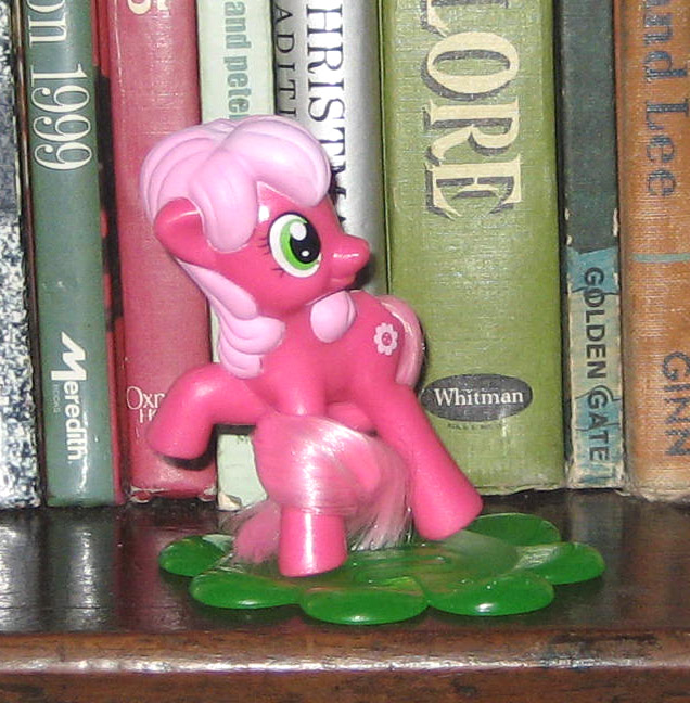 Cheerilee is based on the Generation 3 earth pony of the same name. She is a unicorn pony in My Little Pony Crystal Princess: The Runaway Rainbow, and her design was combined with Cherry Blossom to create her Core 7 incarnation, which later been retconed to her current appearance. In the Core 7 serials, she is the older sister of Scootaloo and her main personality trait is intelligence. Her name is not stated on-screen in the show, but her name and design are used in the McDonald's Happy Meal toy sets. The toy Cheerilee's cutie mark is different from on-screen Cheerilee's cutie mark: the toy's is a smiling flower with two small flowers and four green leaves, while the show's is three smiling flowers with pink petals.